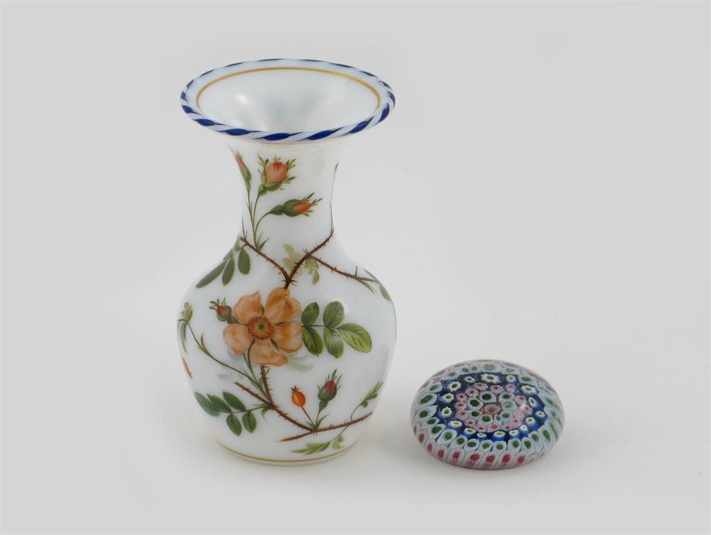 An opaline glass vase, painted with dog rose, and a millefiore paperweight. (2)