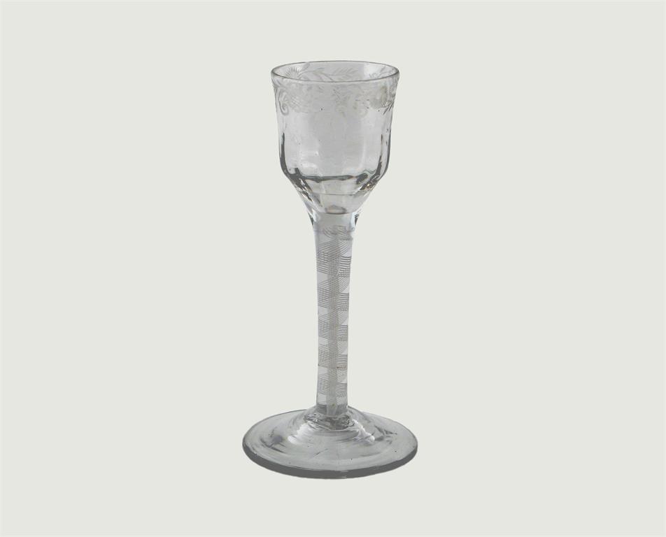 A wine glass, the moulded bowl engraved with a scrolling foliate design, raised on a double series opaque twist stem, mid 18th century, minor faults, 14.8cm.