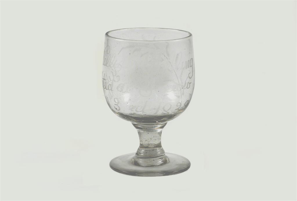 An unusual engraved goblet, inscribed 'William Jobling Gibbeted at Jarrow Aug 3rd 1832', 9.7cm.