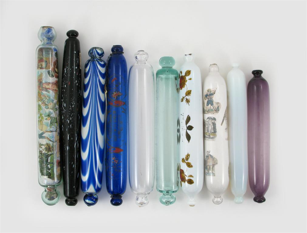 Ten glass rolling pins, variously decorated with enamel, decalcomania and different coloured glass, 19th / 20th century, some damages, 44cm max. (10)