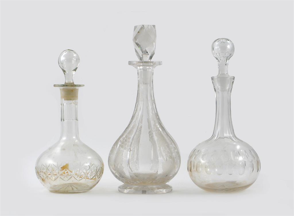Three decanters and stoppers, one faceted and engraved with a crest of a lion between grapevine bands, the other two cut with bands of stars or ovals, 19th / early 20th century, minor faults, 32cm max. (6)