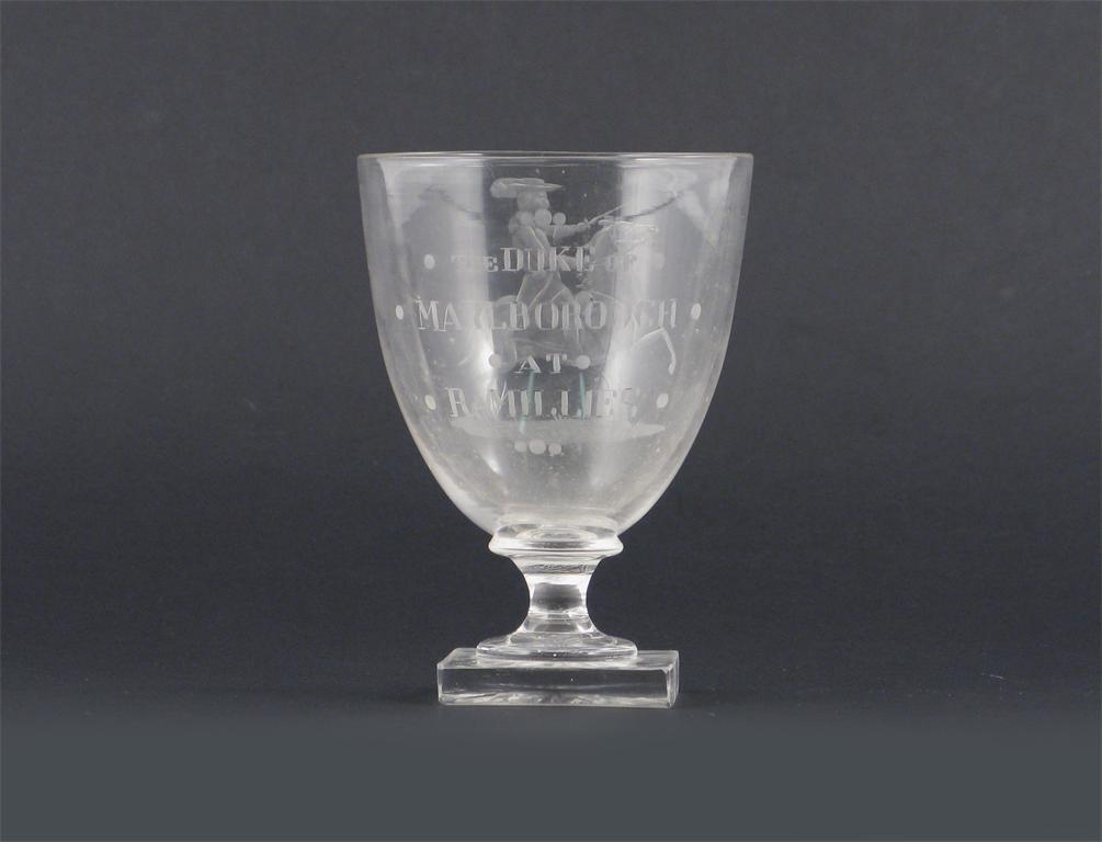 A glass rummer, engraved with a figure on horseback, titled 'The Duke of Marlborough at Ramillies', raised on a square starcut base, 19th century, 12cm.