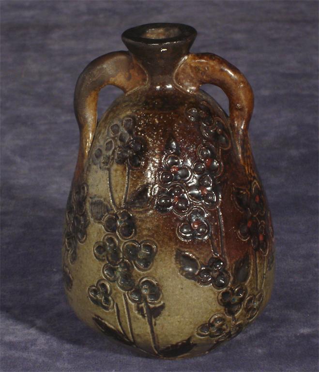 A Martin Brothers stoneware miniature vase twin-handled form, incised with berried foliage in shades of brown incised Martin London, restored handle 9cm. high