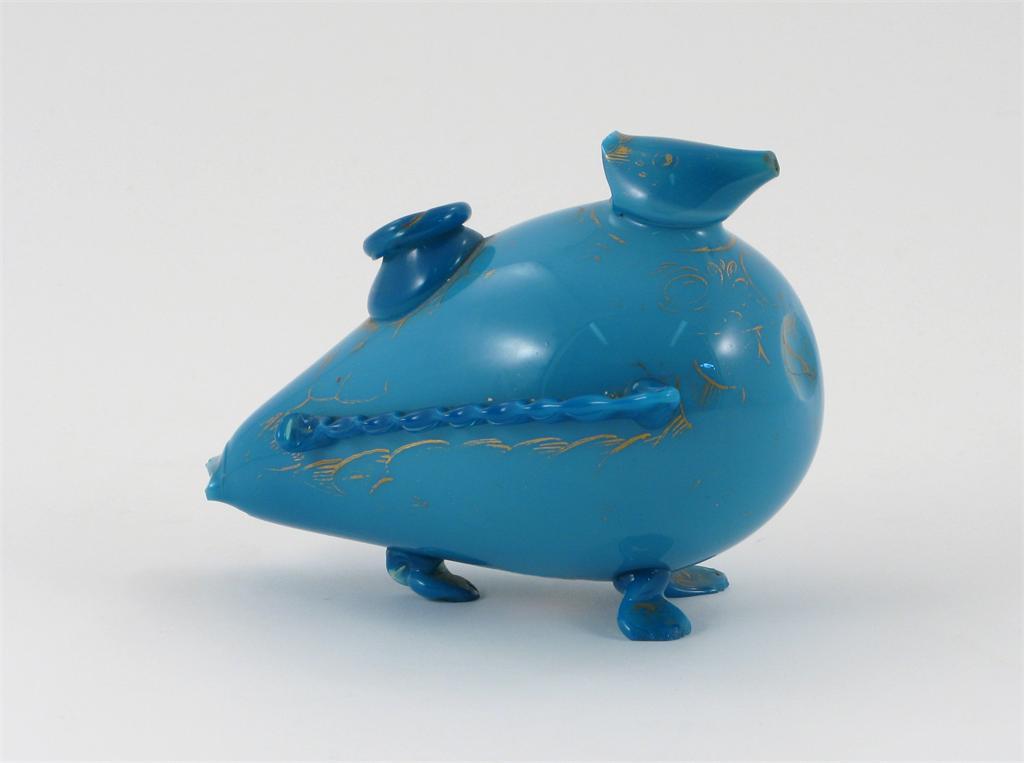 A Middle Eastern glass bottle or flask, modelled as a mythical three-footed beast with a small head, apparently gilded with plumage, some damages, 15cm.