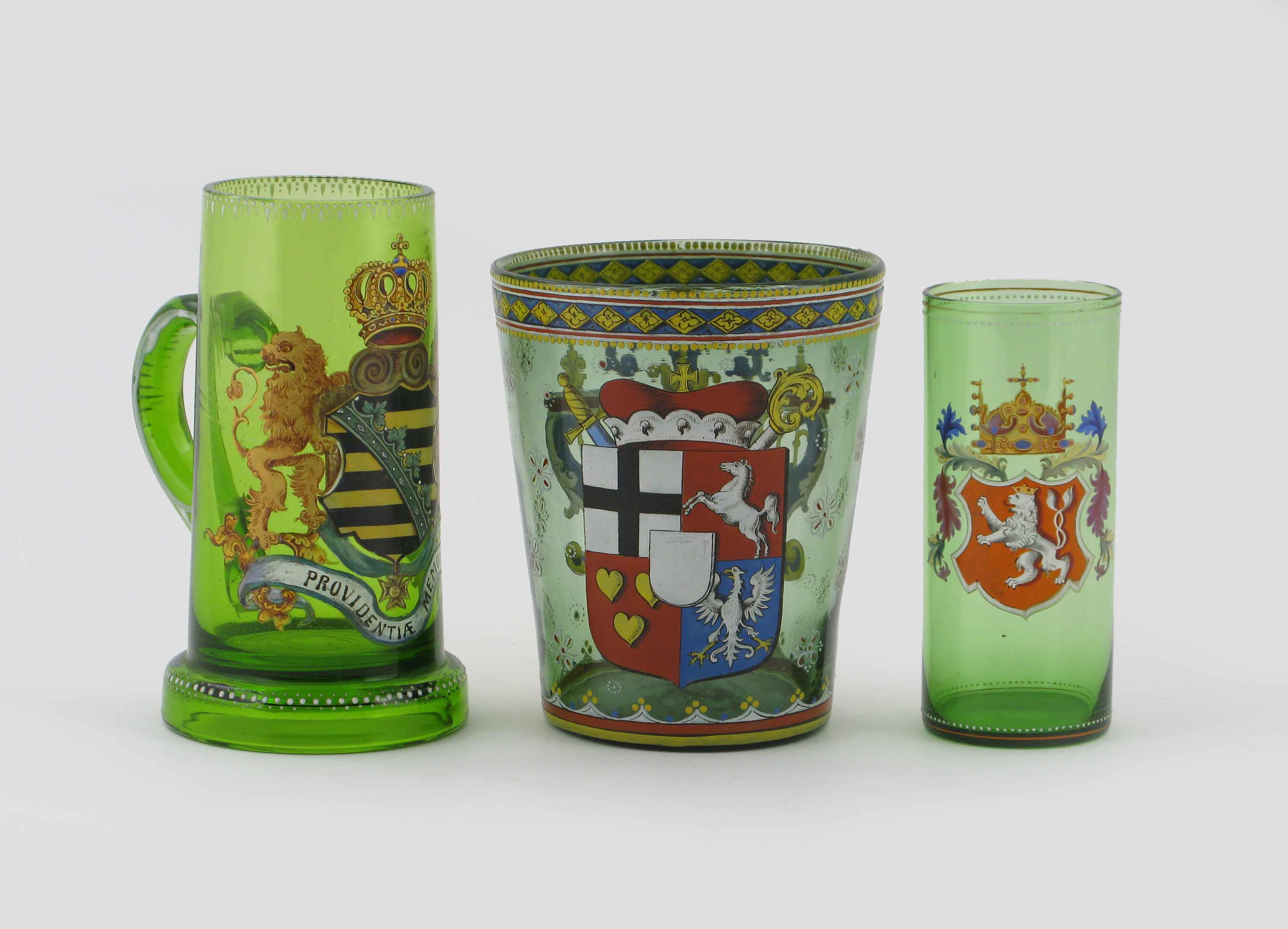 Three Bohemian and German glasses or tankards, variously enamelled with the arms of Saxony, Bohemia and a quartered shield including the horse of Lower Saxony, 19th / 20th century, 17.3cm max. (3)
