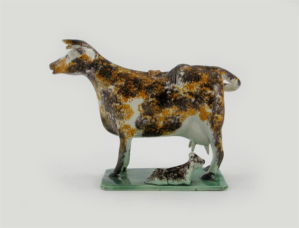 A Yorkshire pearlware cow creamer, the heifer's calf recumbent near her waiting udder, sponge decorated in ochre and manganese, c.1800, some good restoration, 18cm.