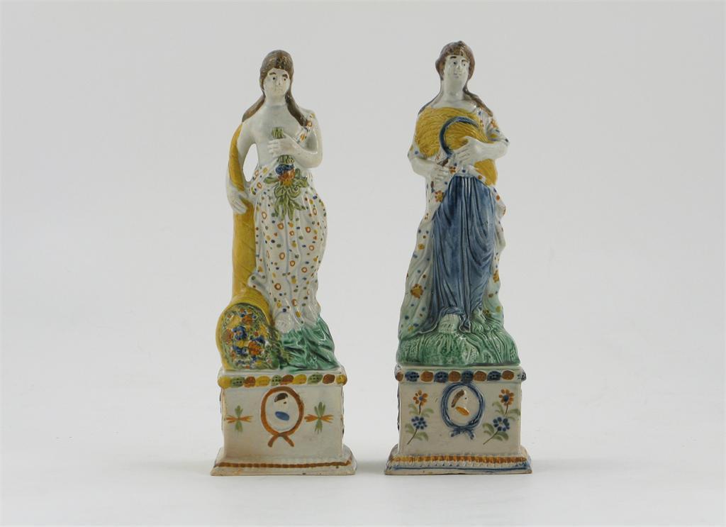 Two Prattware models of Spring and Autumn, personified as Classical figures holding a wheat sheaf and a cornucopia of flowers, raised on tall square bases, late 18th century, a few small chips to one base, 26cm. (2)