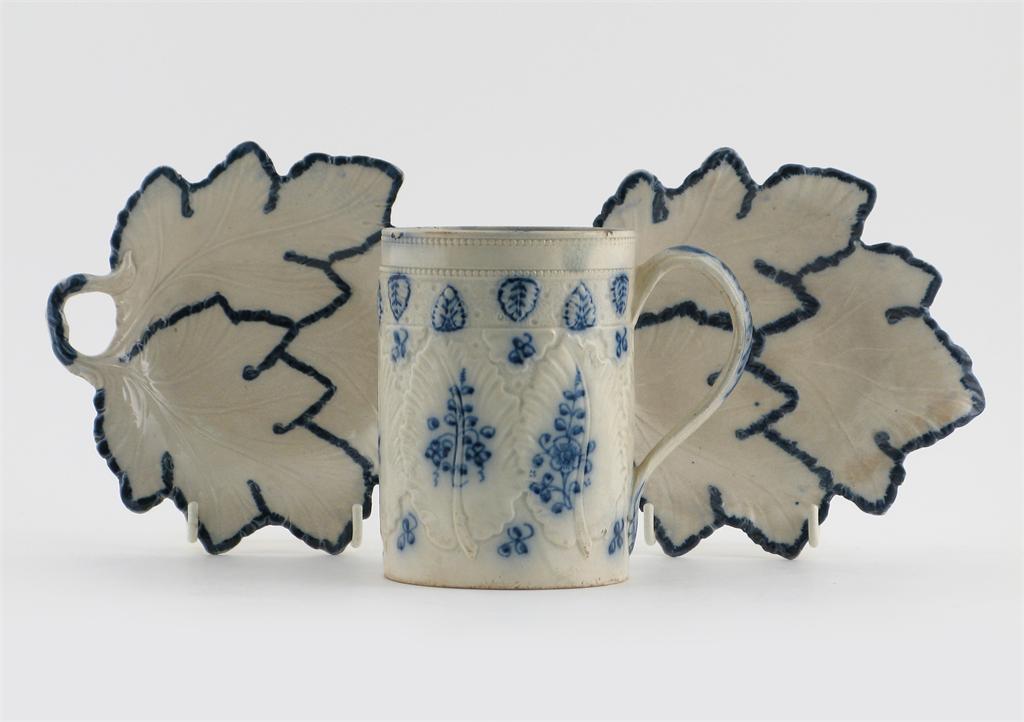 A pearlware leaf-moulded mug, probably Swansea, painted in blue with stylized floral motifs, and a pair of pearlware vine leaf dishes, late 18th / early 19th century, minor faults, 17.5cm max. (3)