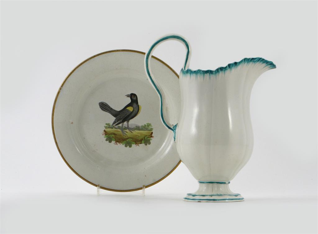 A large Wedgwood creamware jug, highlighted with turquoise enamel, impressed mark, and a creamware ornithological plate painted and titled to the reverse with a 'Yellow Winged Pye', late 18th century, a small chip to the underside of the plate, 23cm max. (2)
