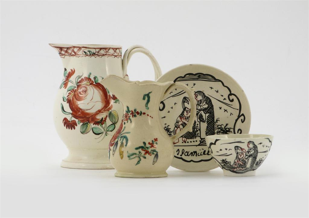Two creamware jugs, both enamelled with flowers in shades of red, green and yellow, and a Dutch-decorated creamware teabowl and saucer painted in red and black with two figures in a cartouche, late 18th century, minor faults, 12.5cm max. (4)