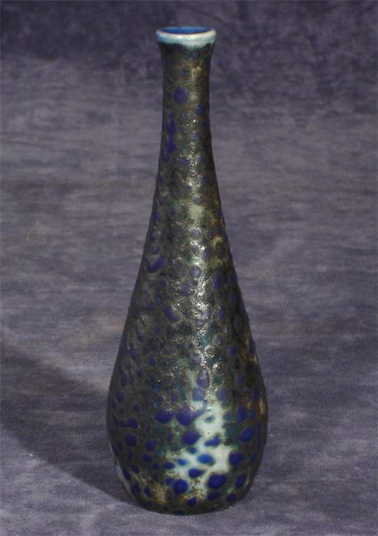 A Martin Brothers stoneware miniature vase tall necked covered in blue glazed dot decoration...