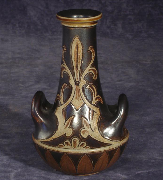 A Martin Brothers stoneware vase twin-handled form, incised with a band of scrolling foliage in shades of brown incised 8-1897 Martin Bros London & Southall 12.5cm. high