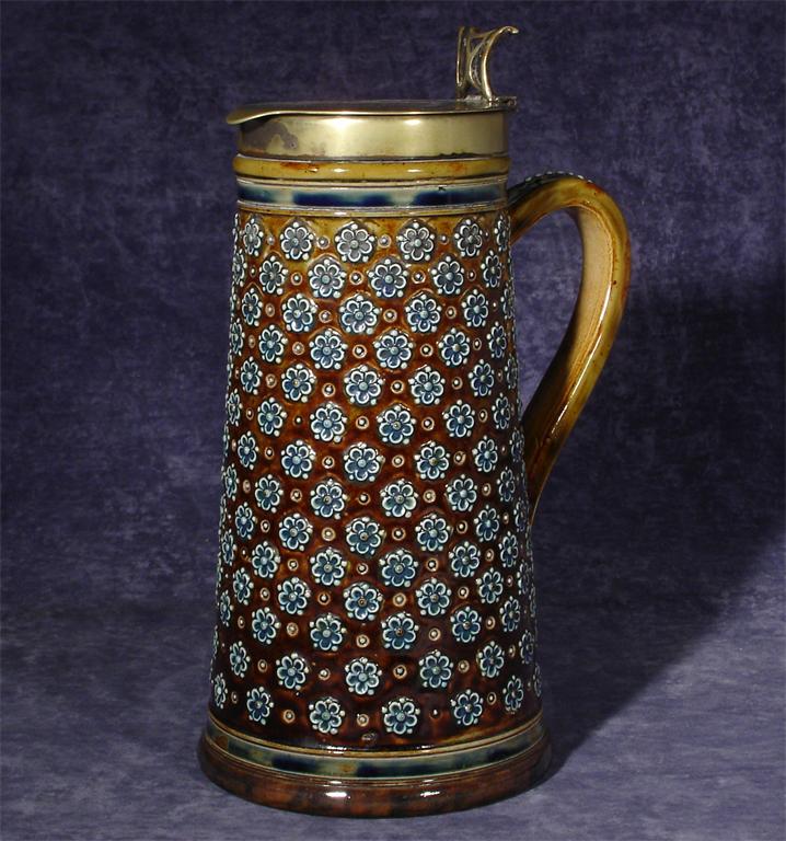 A Doulton Lambeth stoneware jug with electroplated rim and hinged cover, dated 1876, with applied florets in blue on an ochre ground impressed and incised marks 24cm. high