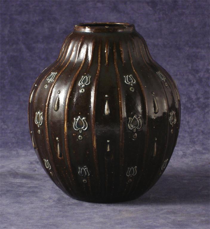 A Doulton Lambeth stoneware gourd vase with applied tubelined flowers, in shades of blue on a brown ground impressed Doulton Lambeth mark 17cm. high Desmond Eyles & Louise Irvine The Doulton Lambeth Wares Richard Dennis page 218 for comparable examples