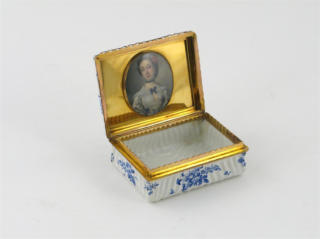 A good enamel gold-mounted snuff box, the exterior painted with delicate sprays of bright blue flowers on a moulded chevron wave ground, the interior fitted with a finely painted portrait of a young lady with flowers in her hair, 2nd half 18th century, a little overpainting to the edges, 8.3cm.