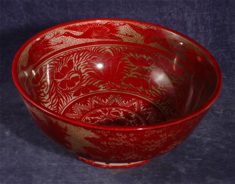 A Bernard Moore porcelain bowl internally decorated with a band of flying cranes above a band of...
