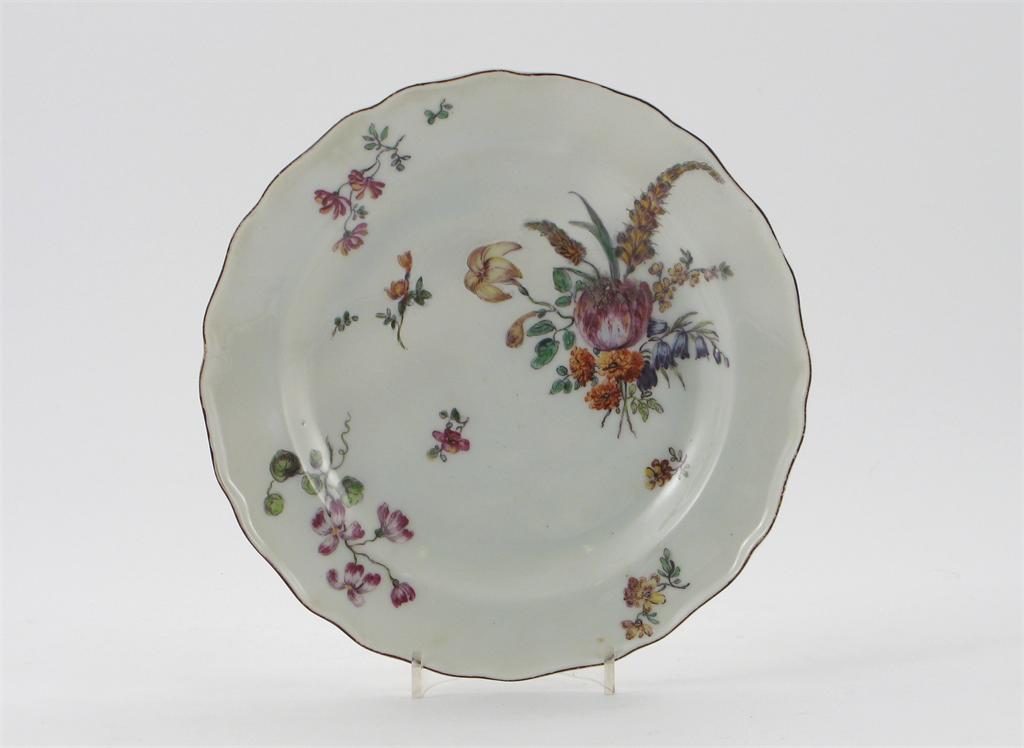 A Chelsea plate, finely painted with a floral spray including tulip and bluebell, amidst scattered blooms and stems, brown line rim, red anchor mark, c.1755, restored, 20.7cm.