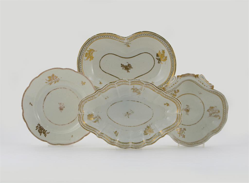 A Caughley part dinner service, gilded with flowers within an ovolu border, impressed P marks to some, late 18th century, some wear and damages. Comprising: five shaped dishes and four plates. (9)