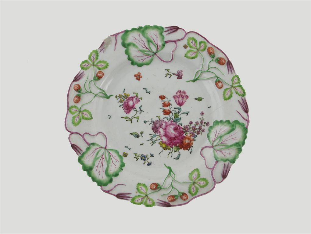 A Longton Hall strawberry dish, moulded with three leaves and three fruiting sprays, the well brightly enamelled with flowers, c.1756-57, some damages, 23cm.