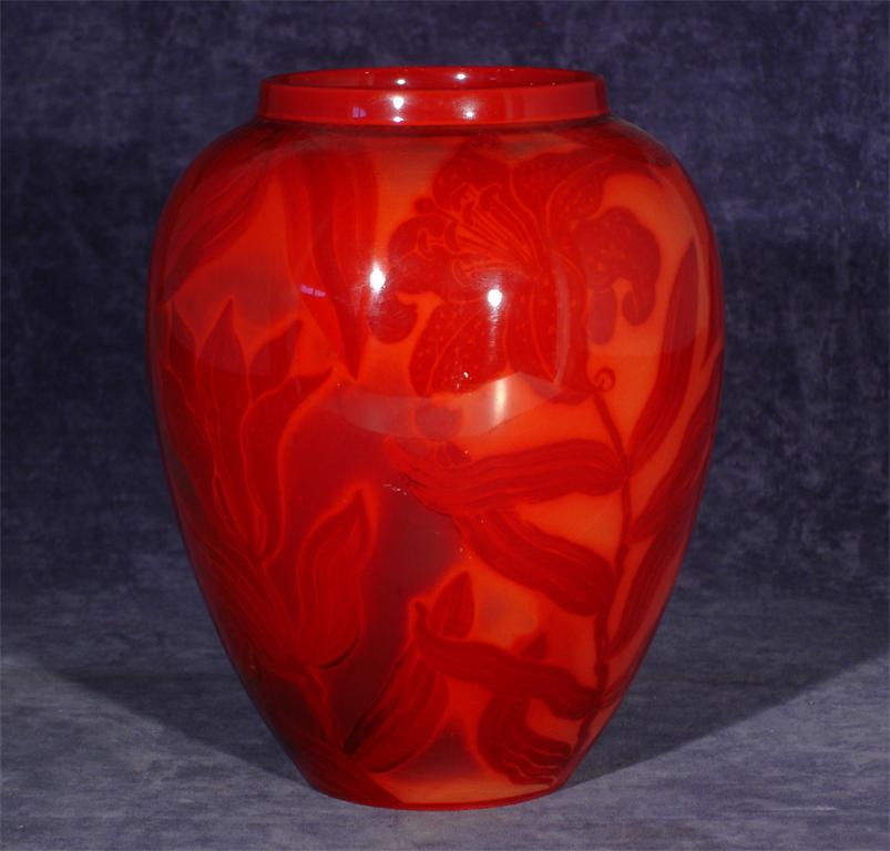 A Bernard Moore porcelain vase by Cicely Jackson painted with lilies in flambe printed BERNARD...