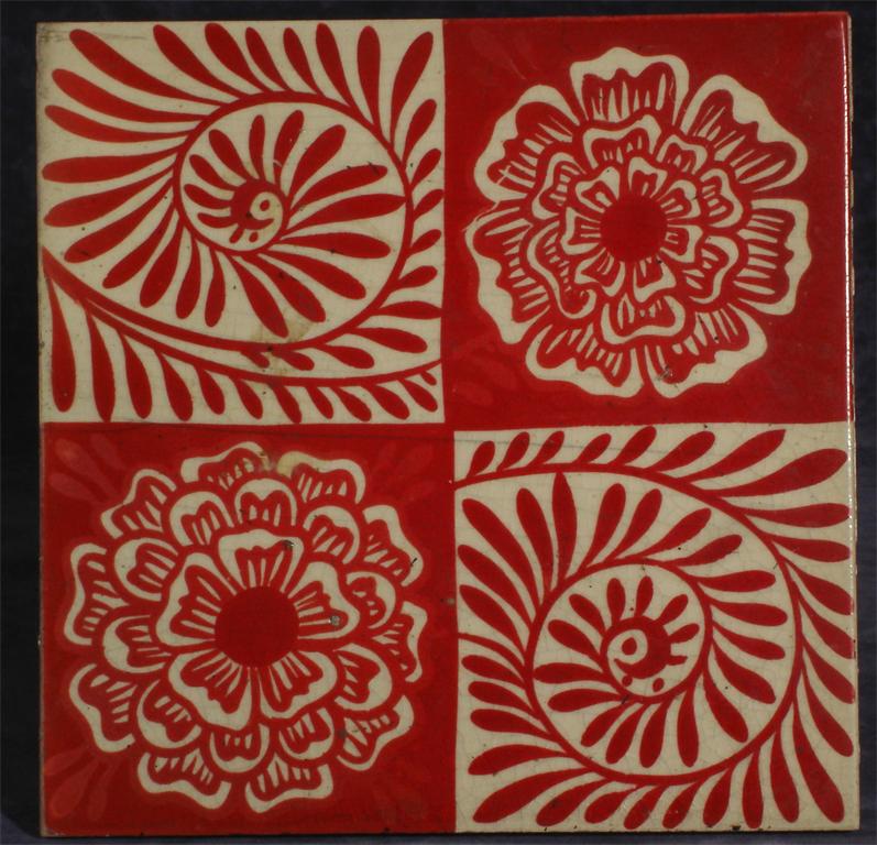 'Rose and Scroll' a William De Morgan ruby lustre tile impressed L 15.5cm. wide Martin Greenwood