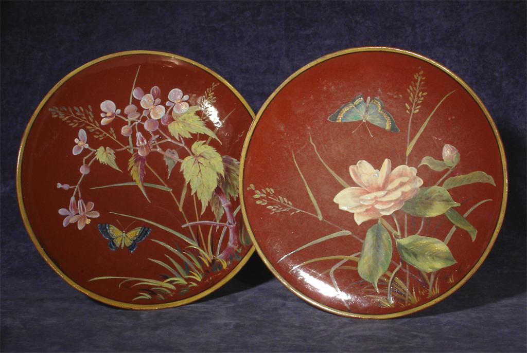 A pair of Mintons' Art Pottery Studio plates painted with butterflies flying past orchids and...