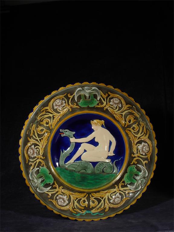An Interesting Wedgwood 'Majolica' wall charger modelled in low relief with the sea nymph Thetis