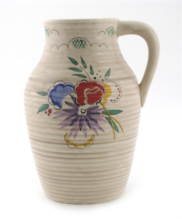 A Clarice Cliff single handled Lotus jug enamelled in colours with a floral spray on a mushroom...
