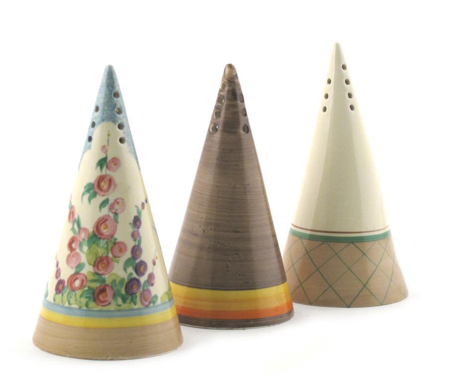 'Hollyhocks' a Clarice Cliff Conical sugar sifter, painted in colours, and two other Clarice Cliff Conical sugar sifters printed marks 14cm. high