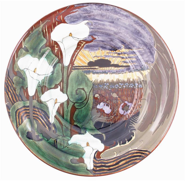 A large Rozenburg den Haag Art Nouveau pottery charger painted with white calla lily stems before...