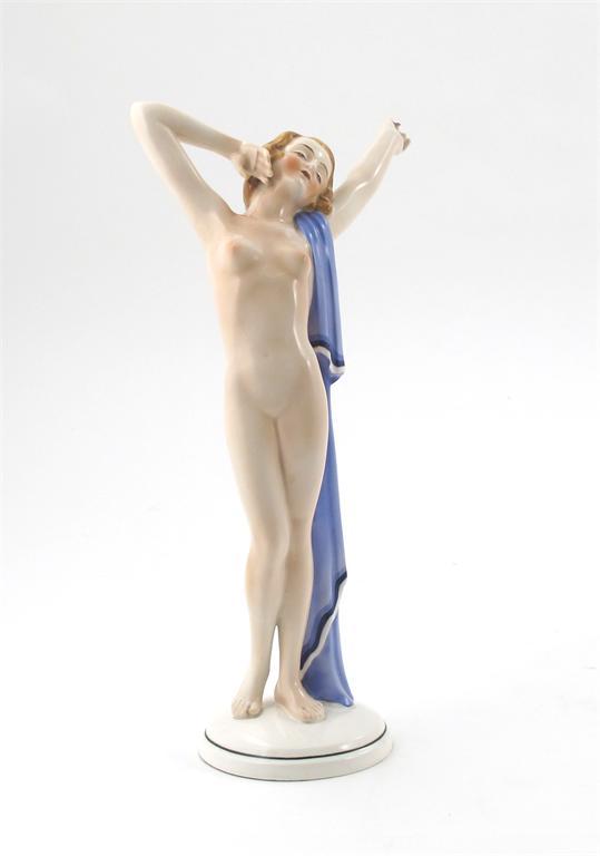 A Katshutte Pottery figure of an awakening maiden, a blue towel draped over her shoulder printed mark F79, chipped finger 28cm. high