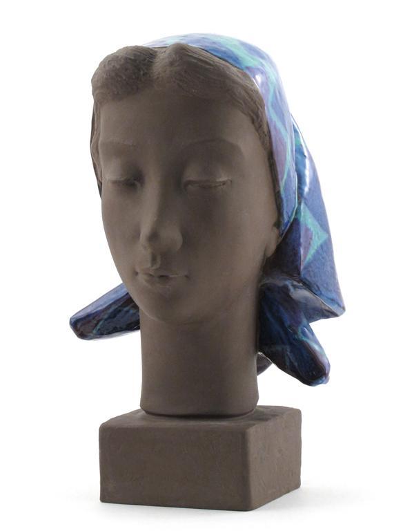 A Royal Copenhagen pottery bust of a woman, model no.159/2897, designed by Johannes Hedegaard, modeled wearing head scarf, glazed blue and turquoise, printed and painted marks 33cm. high