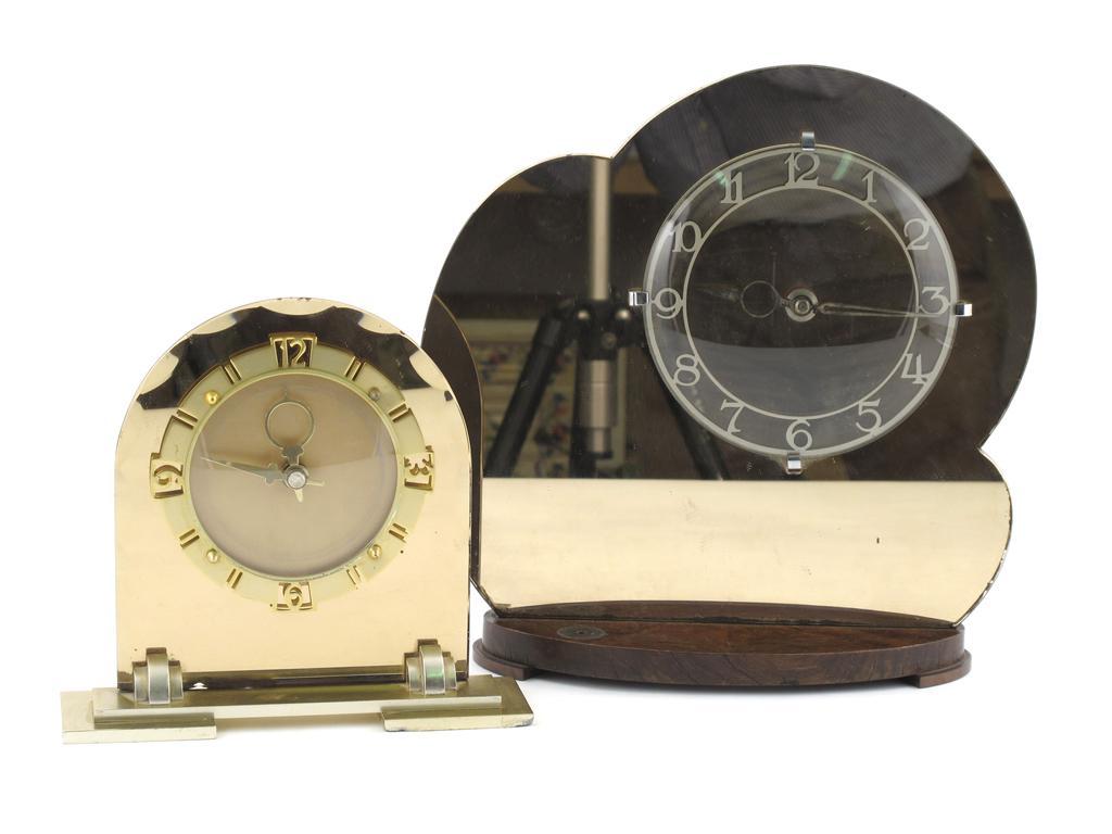 An Art Deco peach tinted mirror glass clock, on shaped wood base, and another similar 31cm. high