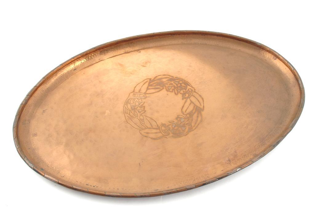 A Hugh Wallis copper tray, elliptical form, the well etched with entwined flower wreath, and three other Hugh Wallis trays, stamped marks to all four main 50cm. wide