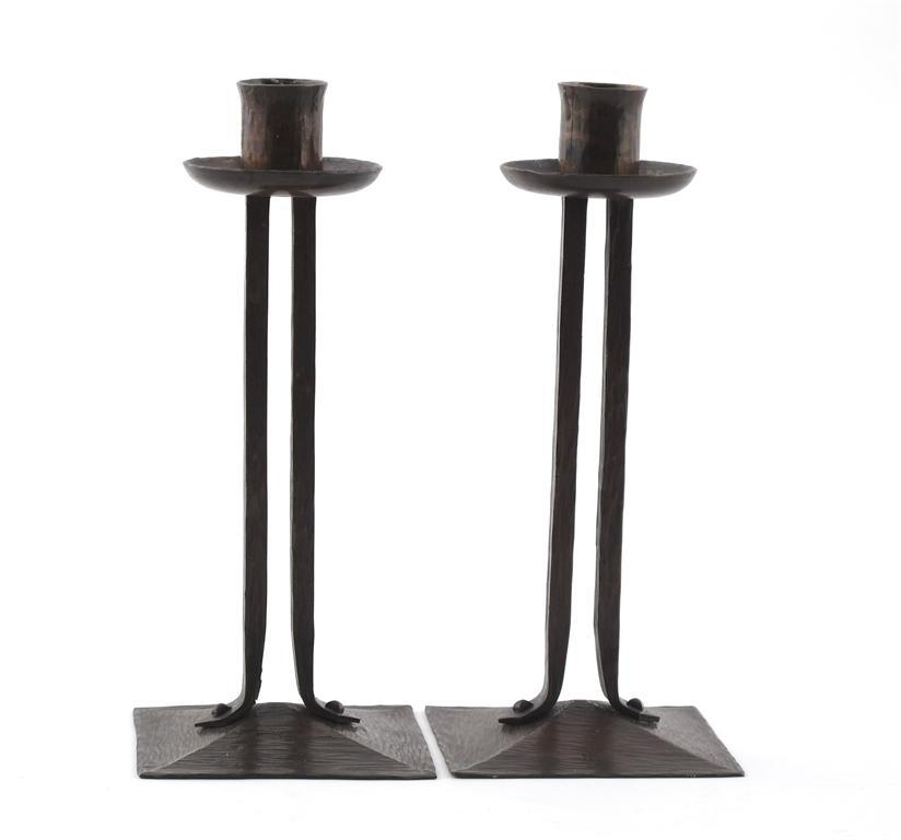 A pair of Roycroft Workshop patinated copper Princess candlesticks