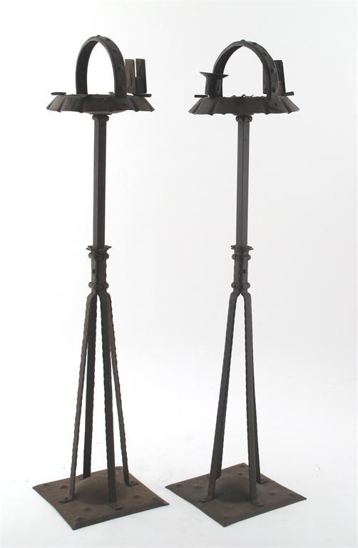 A pair of floor standing patinated metal smoker's compendium