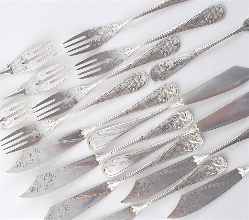 A set of Art Nouveau electroplated fish forks and knives, cast in low relief with ivy leaves, stamped marks