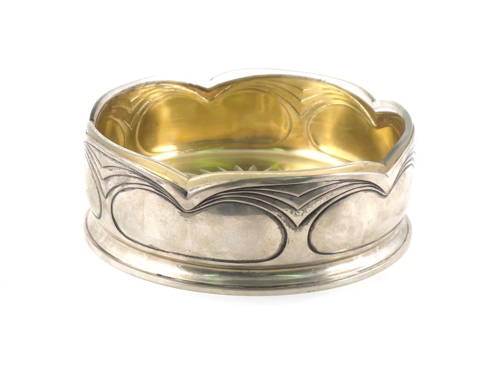 A Peter Bruckmann Secessionist silver bowl with glass liner, circular, cast in low relief with abstracted foliate design stamped marks 19cm. diam.