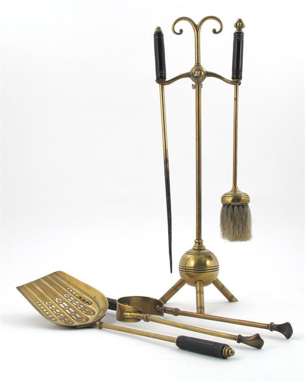 A set of Aesthetic Movement Benham & Froud brass and ebonised wood fire tools, the design attributed to Dr Christopher Dresser, on tripod stand feint cast mark 49cm. high