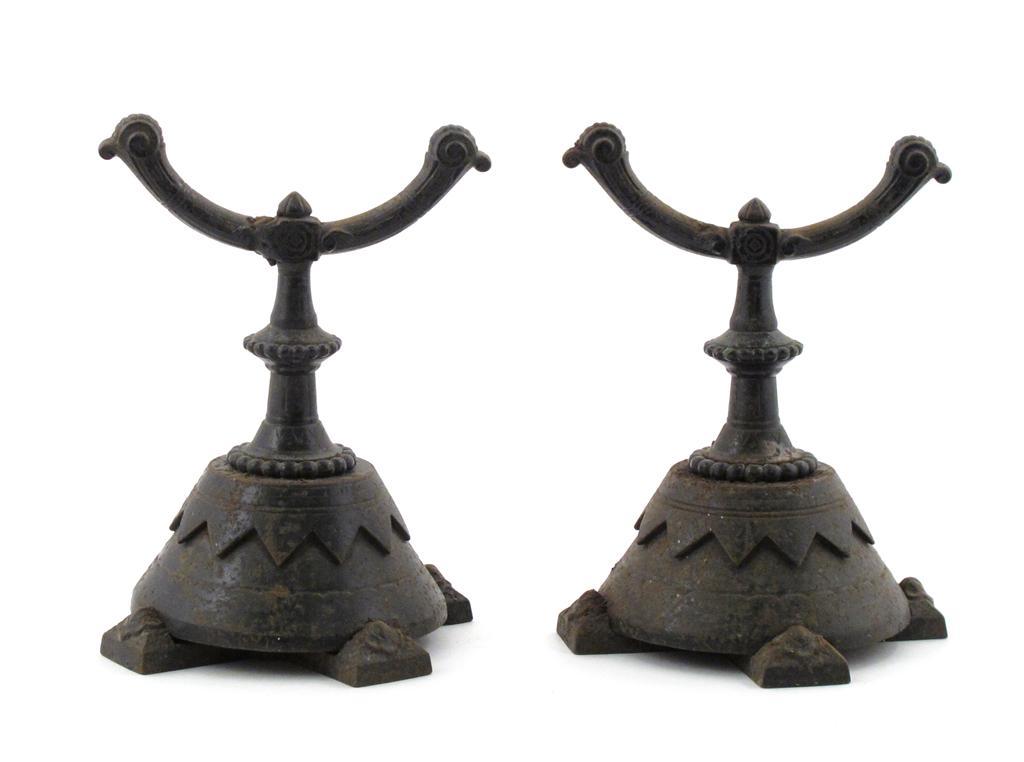 A pair of wrought iron fire dogs, designed by Dr Christopher Dresser, tapering domed foot with knopped central stem, with cast decoration cast regd diamond 20cm. high
