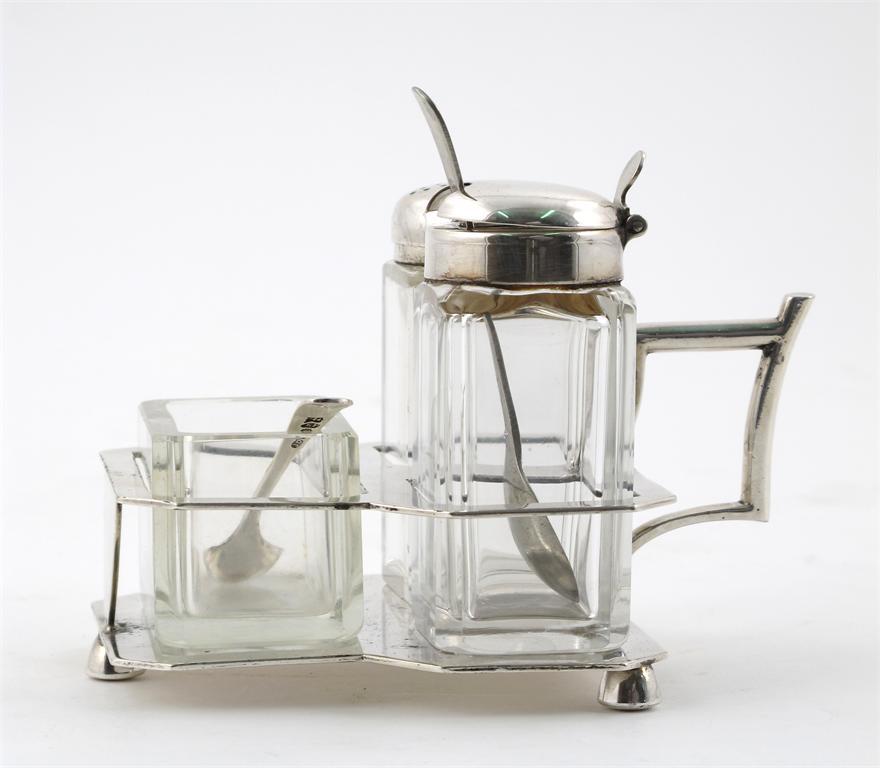 A Hukin & Heath electroplated metal and glass cruet, model no.49, the design attributed to Dr Christopher Dresser, angled handle, the faceted tray on three bun feet, with glass bottles, stamped marks, 12cm. wide