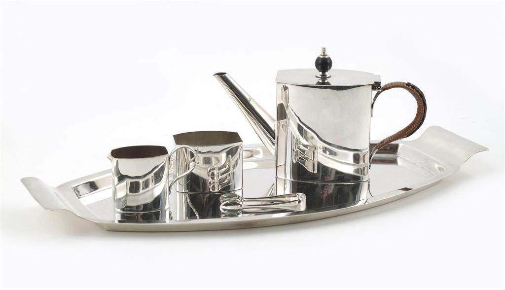 A Hukin & Heath electroplated metal three piece tea set, model no. 1643, on shaped twin-handle tray, comprising teapot and cover with ebonised wood finial, milk-jug, sugar basin and tongs stamped marks to tray and tea pot