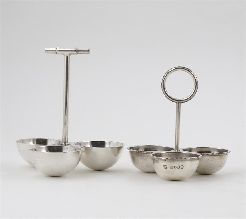 An Elkington & Co electroplated cruet tray, designed by Dr Christopher Dresser, with central T bar handle, a Hukin & Heath silver cruet tray and a Hukin & Heath electroplated lily pad bowl various marks 13cm. high