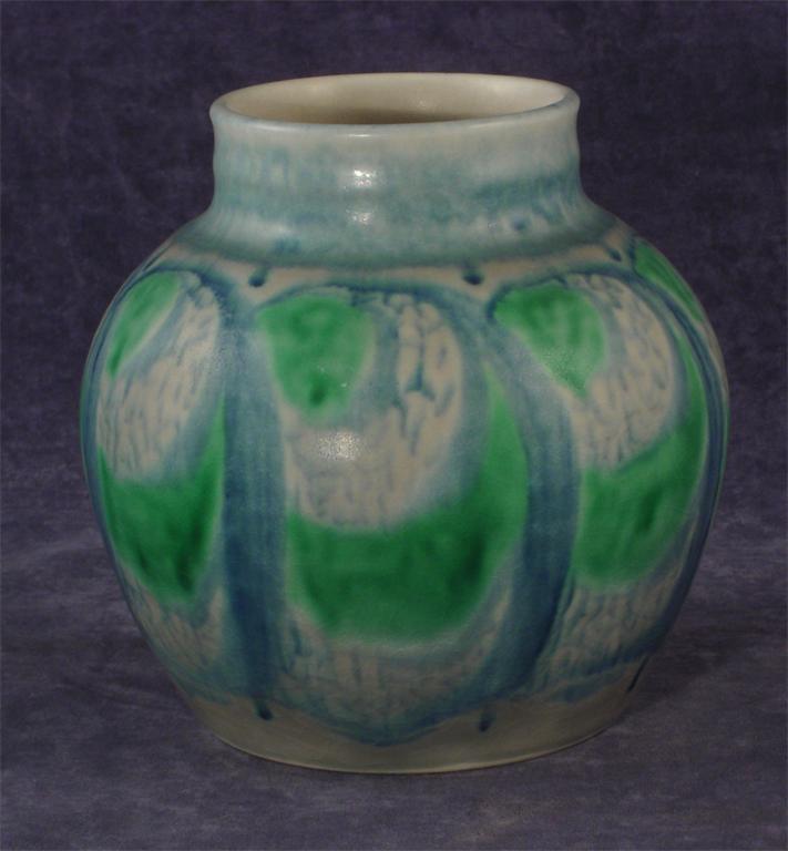 A Pilkington's Royal Lancastrian Pottery Lapis vase shape 8255, thrown by E T Radford, painted by Gladys Rogers, painted in shades of blue and green on a grey ground impressed and incised marks, painted artist cypher 18cm. high