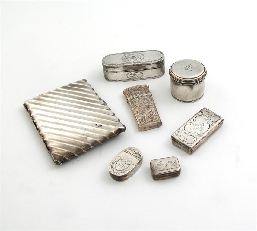 A collection of silver boxes, various dates and makers, comprising a French snuff box, a George III circular silver toilet box, London 1815, a lancet case, three further boxes and an aide memoire. (7)