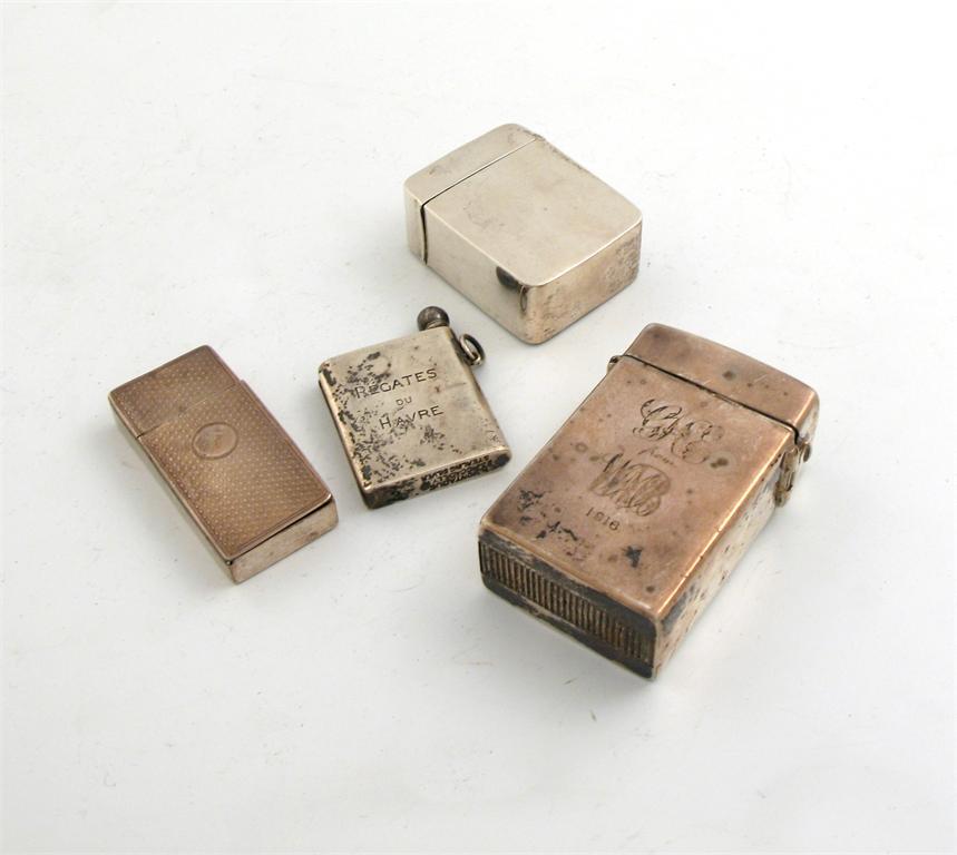 rounded rectangular form, plus a silver snuff box with engine turned decoration, another box and a tinder striker. (4)