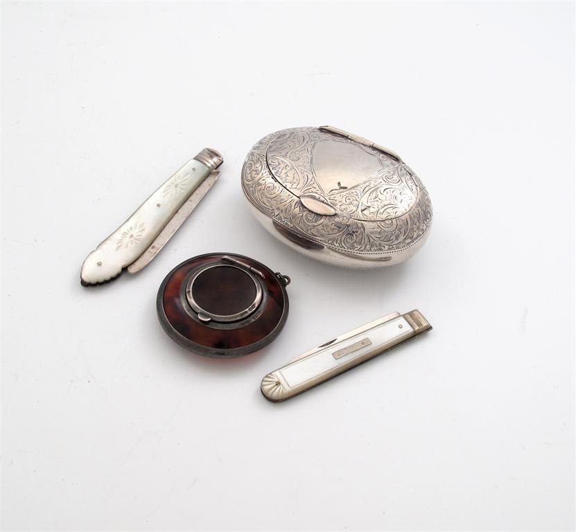 comprising: a squeeze-action tobacco box, of oval form, engraved foliate scroll decoration, Birmingham 1916, a silver mounted tortoiseshell compact, Birmingham 1922, plus two silver and mother-of-pearl handled fruit knives. (4)