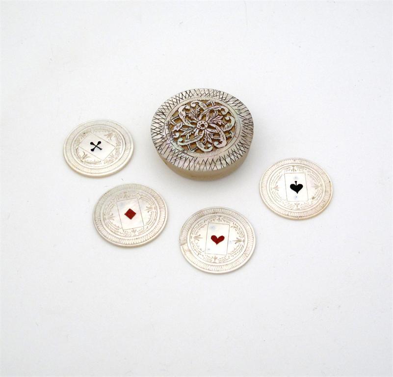 A 19th century mother-of-pearl counter box and four counters,