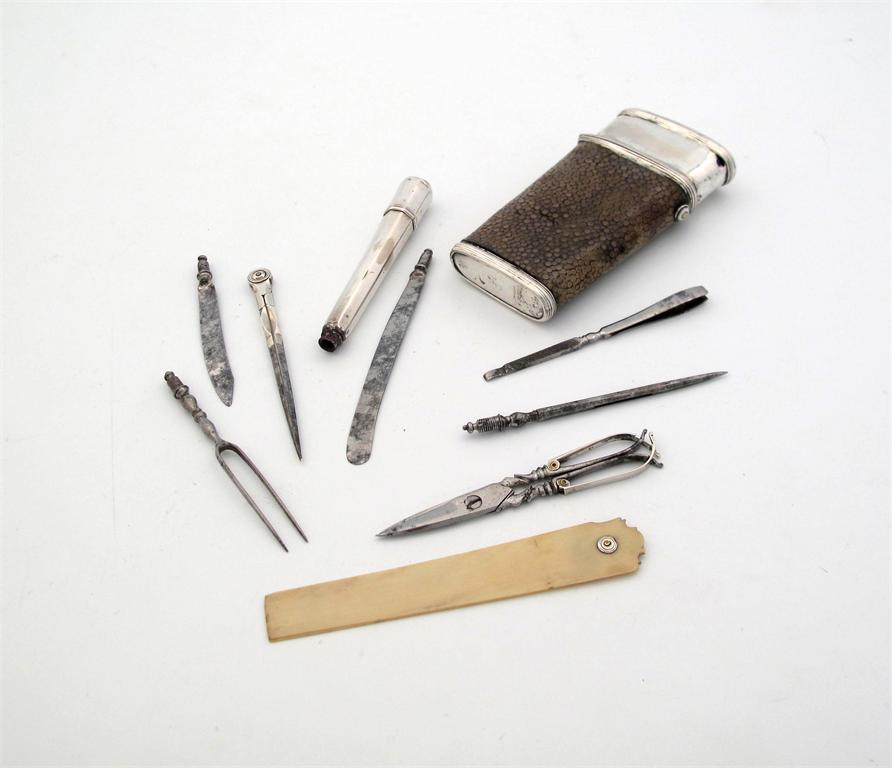 tapering compressed oval form, the based covered in shagreen, the interior with two silver handles, two knife blades, a fork, a bodkin, a nail file/tweezer, a pair of scissors, a pair of dividers, and an ivory ruler, length 9.3cm.