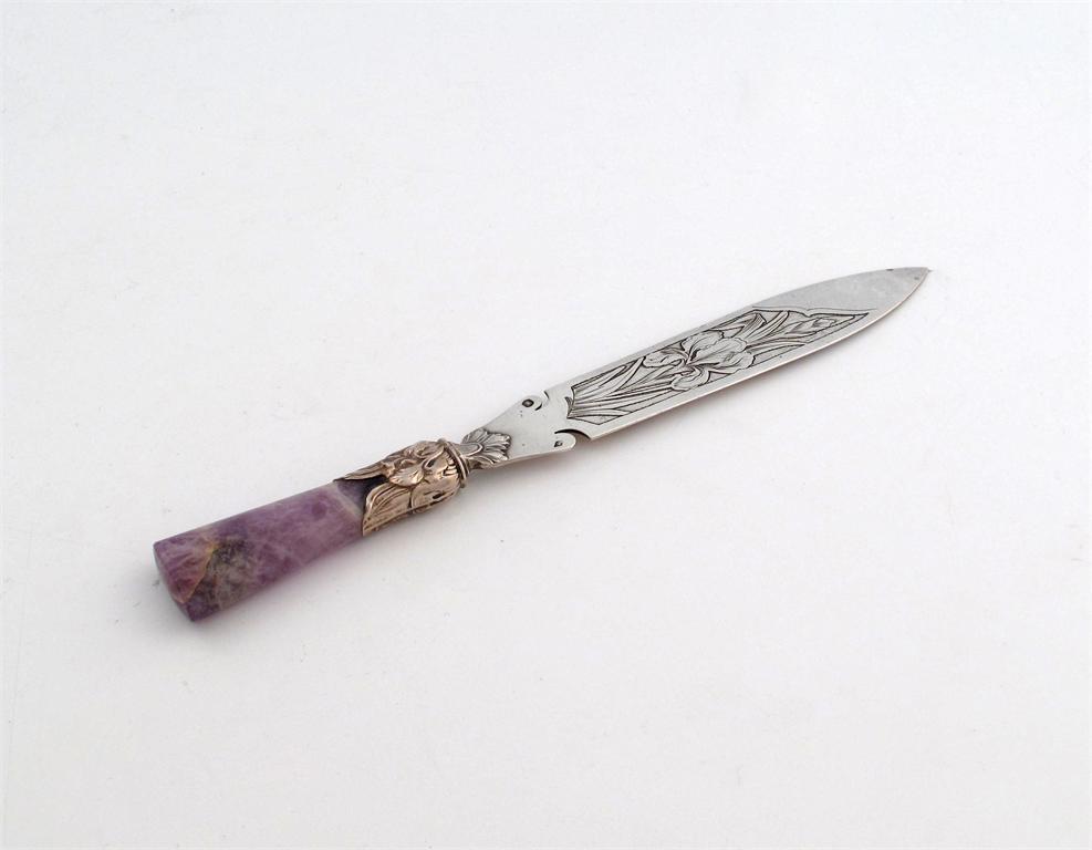 A French silver mounted hard stone paper knife, maker's mark of L.M with a duck between in a lozenge, the blade engraved with irises, the tapering purple handle with foliate mounts, length 20.5cm.